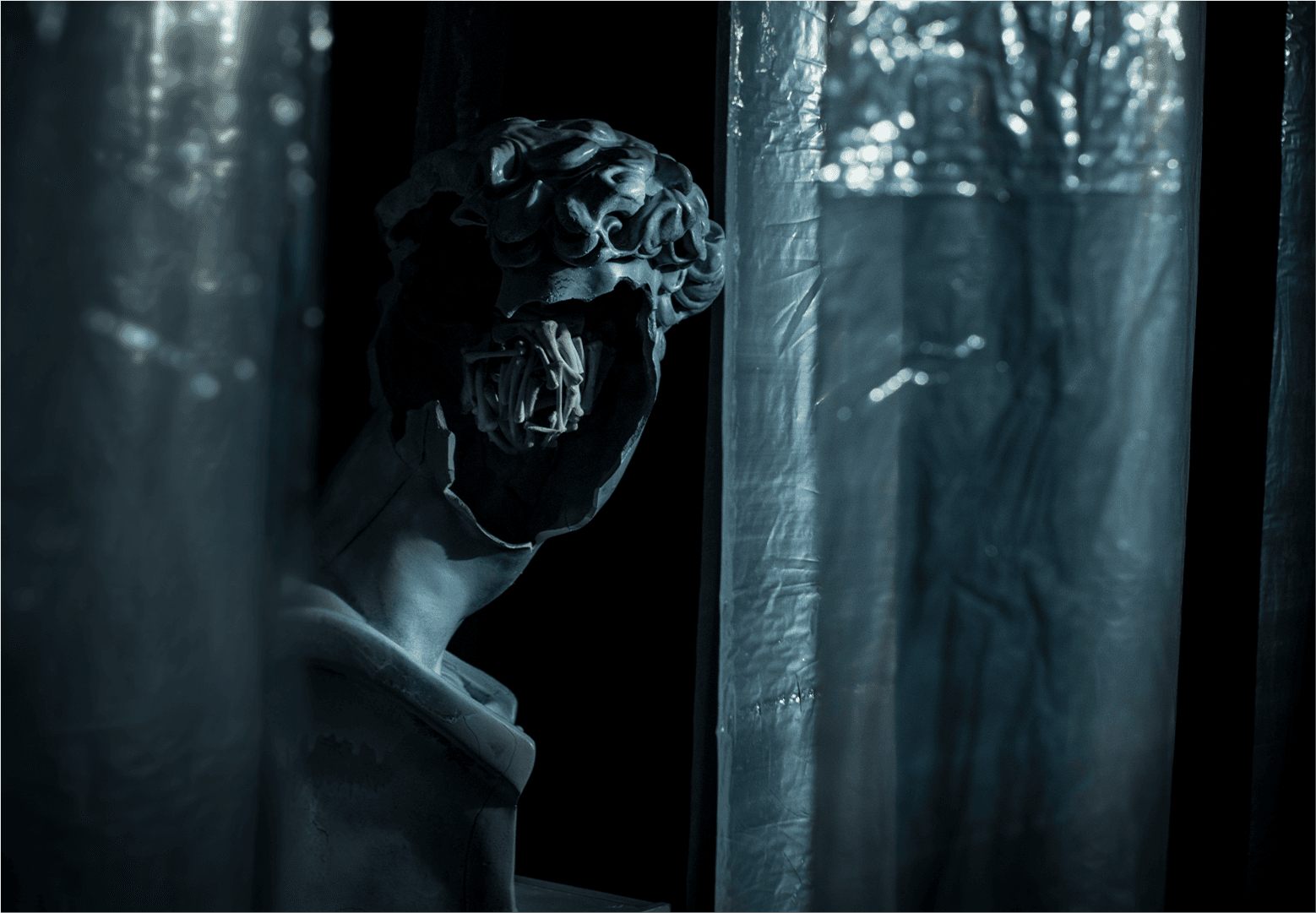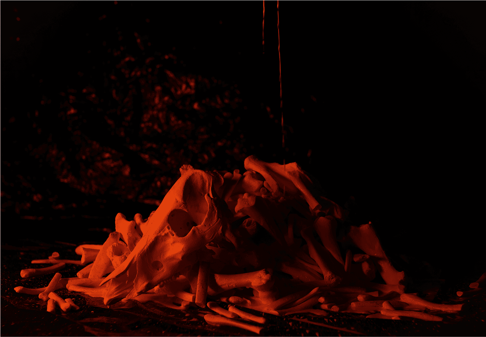 영상에서는 ‘원초아’를 상징하는 짐승의 모습을 돼지의 머리 뼈와 다리 뼈를 이용해 표현했습니다. 두번째로 ‘자아’를 상징하는 모습을 구현하기 위해 부서진 두상 안에 은근히 비추는 선악과(양심)의 조형물을 제작했습니다. 마지막으로 이 모든 것을 조정하는 ‘초자아’를 표현하기 위해 이집트 신화에서의 지배자 호루스를 모티프로 가면을 제작하였습니다.